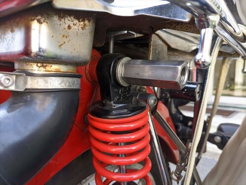 オークションでCT110に付けていた、とされるロッドホルダーを落札。確かにつきそうだけど、そのままだとキャリアに当たるので取り付け部に高ナットをつける。サス上がM12でP1.25、長さが5cm。 スイングアーム側は… ボルト側なので、逆刺しにして、 こっちはM…