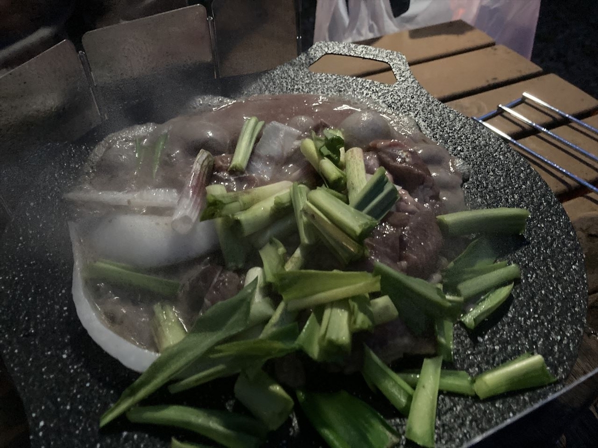 日も暮れてきたのさっそくジンギスカン+ギョウジャニンニクをいただく。